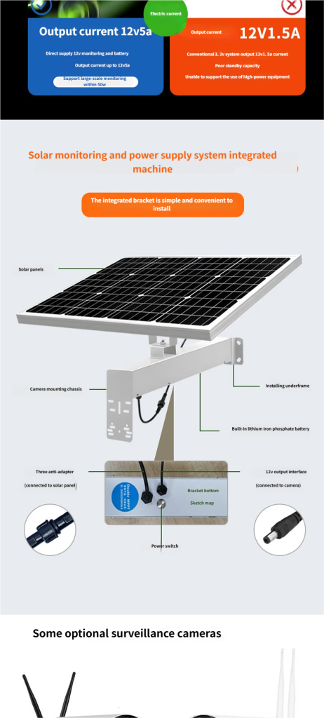 Ideal for security systems, traffic monitoring, perimeter protection, and agricultural or industrial surveillance, this system includes a high-efficiency solar panel, a durable lithium or LiFePO4 battery storage unit, and a smart charge controller designed to optimize energy harvest and extend battery life. The system delivers stable 12V output, perfectly matching the voltage requirements of most professional surveillance cameras.